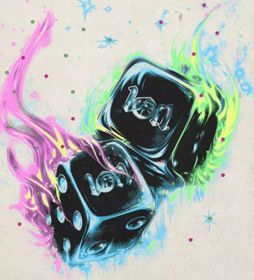 A Camiseta High Rollers da Exclusivist (1OF1) une extravagância e atitude em uma peça que transita entre o street e o psicodélico. Com modelagem boxy levemente alongada, é confeccionada em malha 100% algodão de alta gramatura com efeito estonado que entrega textura e personalidade. O destaque fica por conta dos strass de cristal coloridos aplicados por toda a peça e pela estampa frontal com dados multicoloridos em uma estética espacial alucinante, carregando o logo 1OF1 em evidência. Gola, mangas e barra com leve desgaste reforçam o visual vivido, ideal para quem busca se destacar com autenticidade.