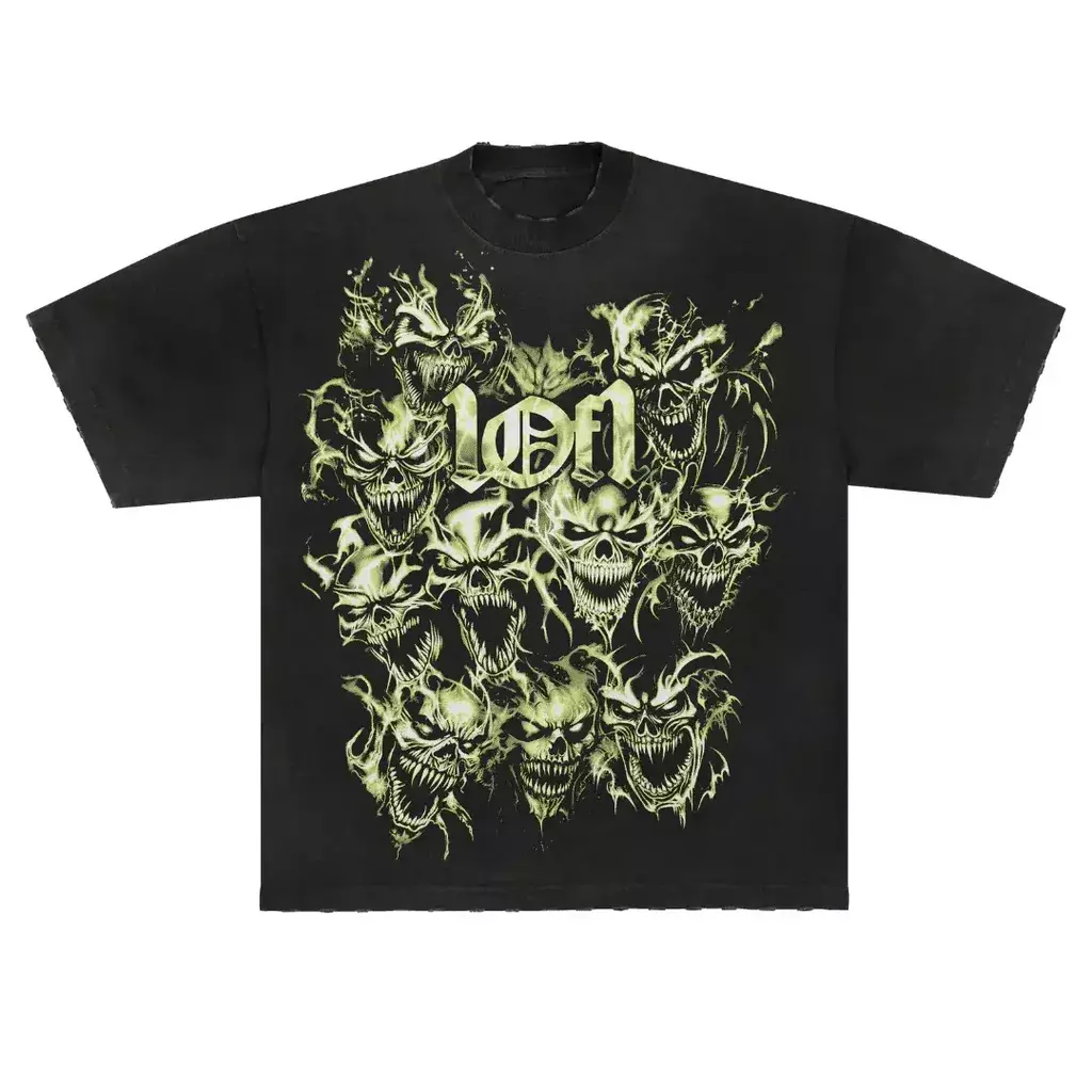 • Estampa frente e costas com arte de caveiras em preto e verde