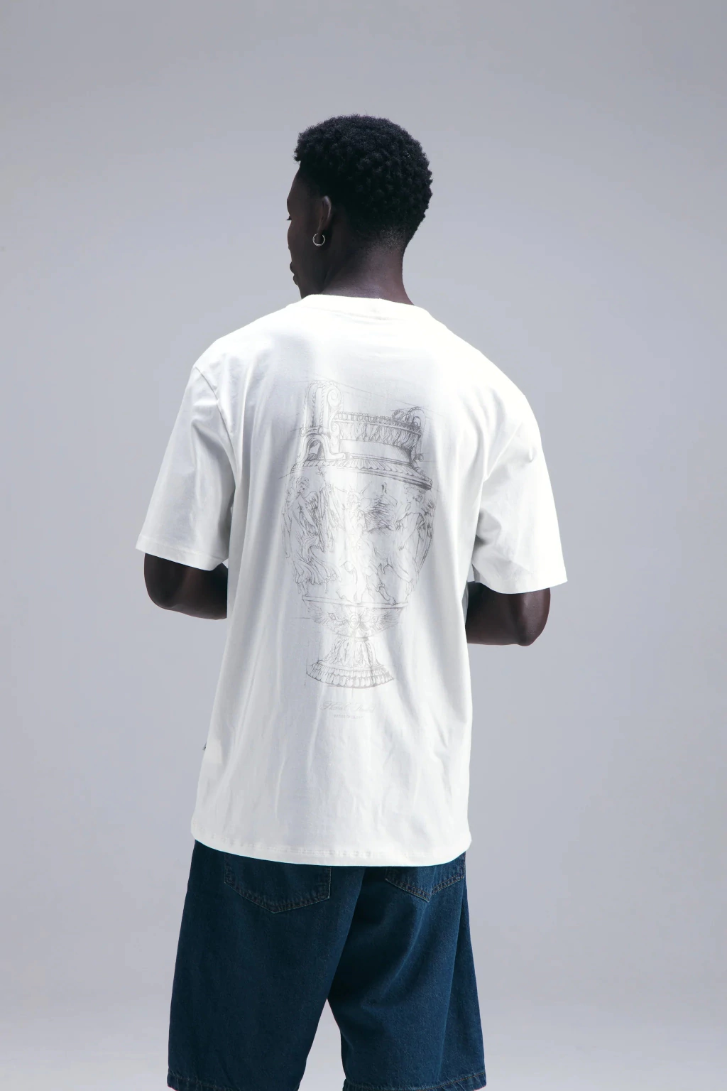 Modelagem com caimento reto, gola careca em ribana 2x1 e reforço interno nos ombros. Estampa aplicada no lado esquerdo do peito e nas costas.