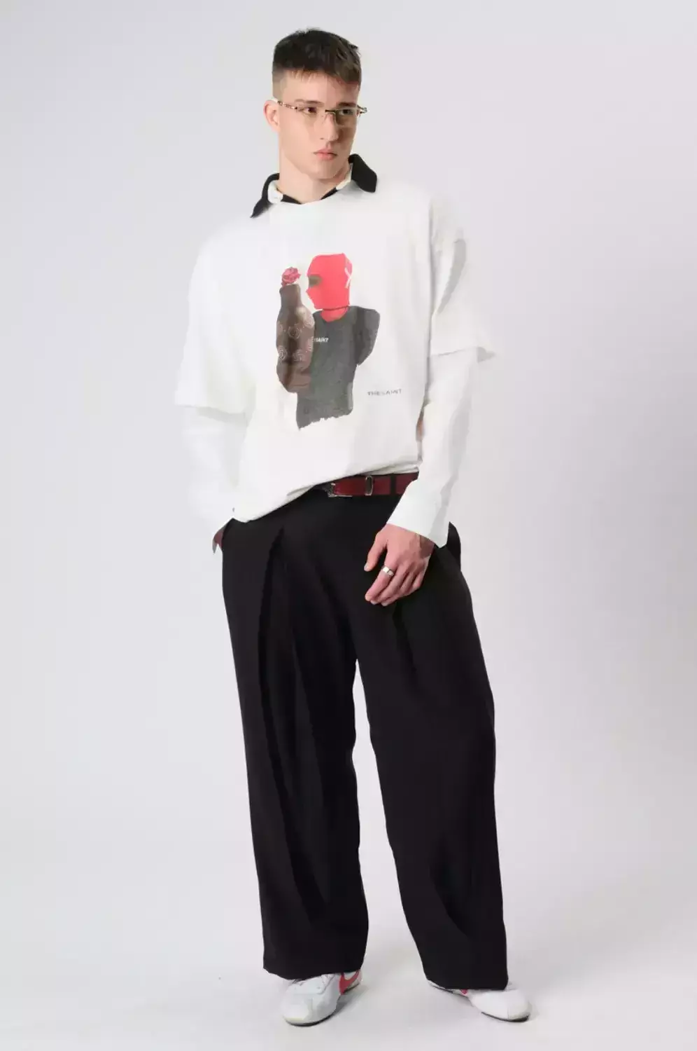 Camiseta Wide Boxy Balaclava apresenta um contraste instigante: um menino travesso, mascarado com balaclava para proteger sua identidade, segura um jarro de rosas. A peça traduz essa dualidade entre rebeldia e sensibilidade, em uma estampa que provoca e desconstrói estereótipos. A modelagem wide boxy é caracterizada por uma silhueta ampla e reta, com ombros estruturados e caimento solto. Confeccionada em tecido premium 100% algodão.